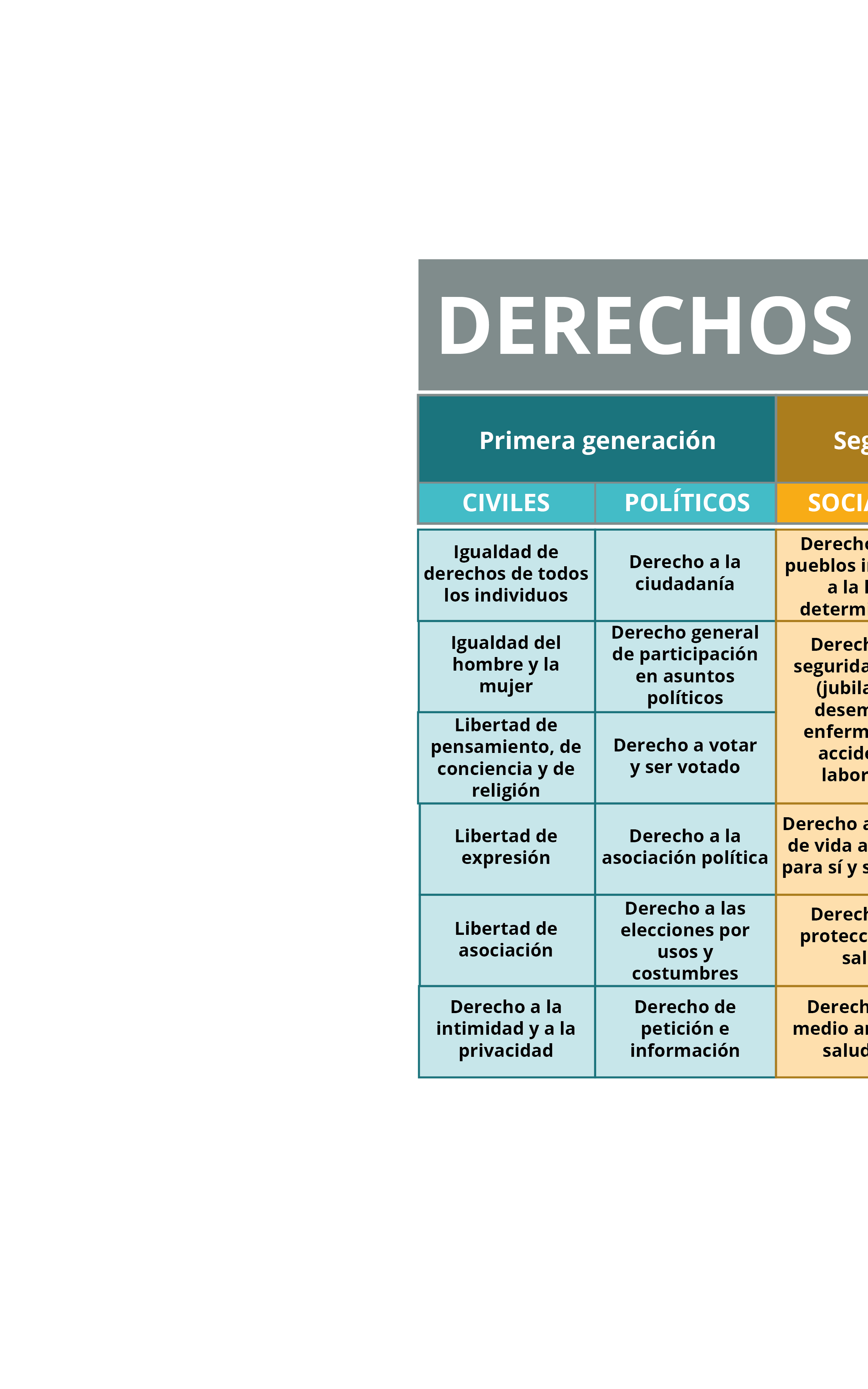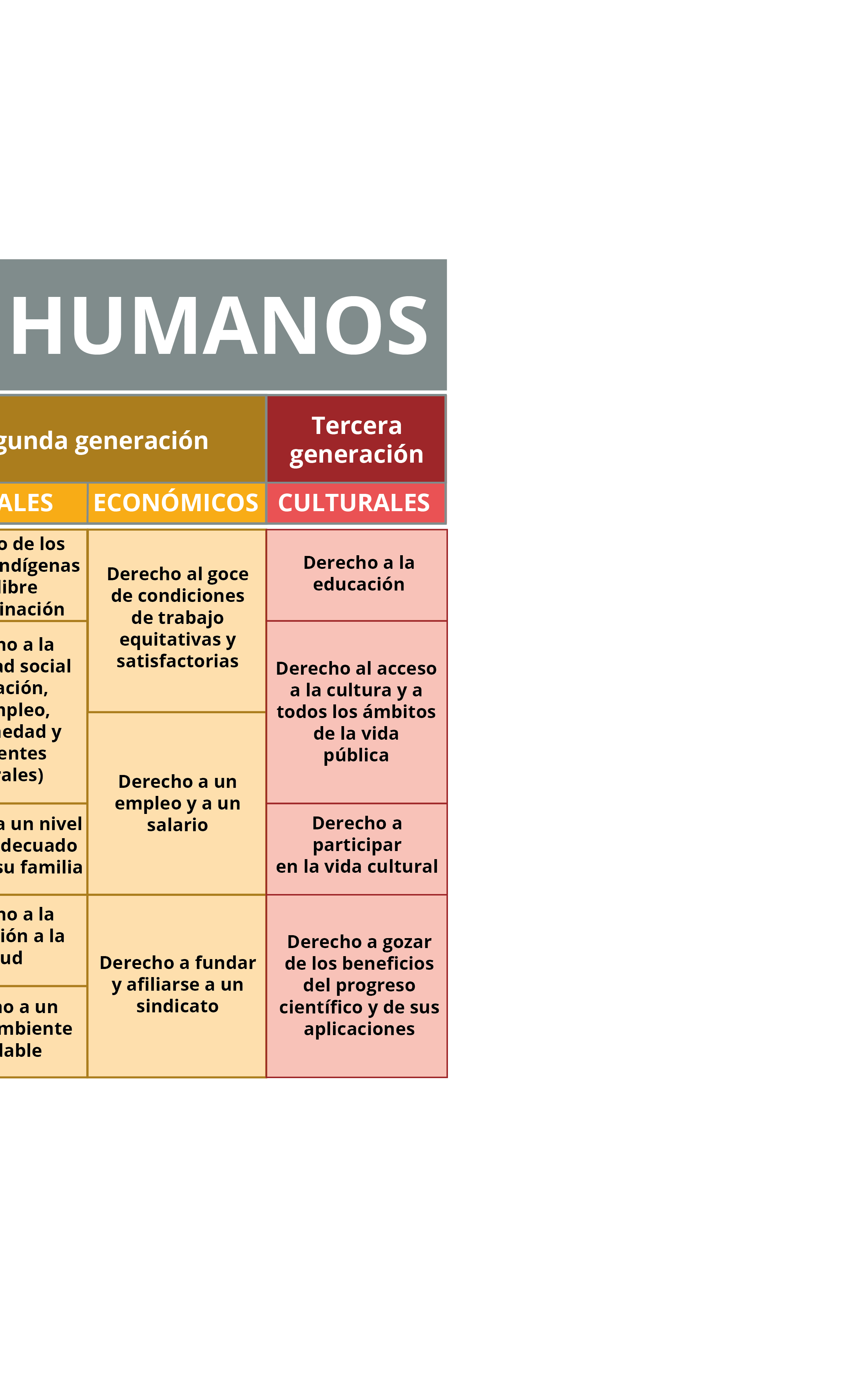 Derechos sociales, económicos y culturales (DESCA): protegen el derecho a disfrutar de condiciones de vida dignas, atendiendo las necesidades económicas, sociales y culturales de las personas. (2ª y 3ª generación)