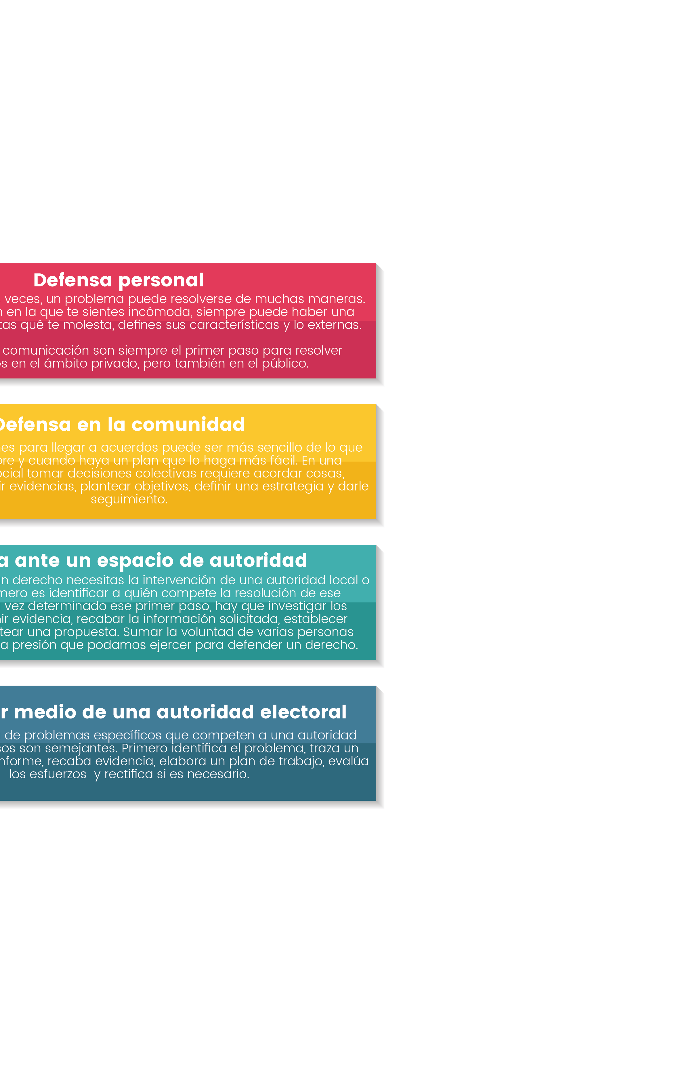 Lo mismo sucede con un plan para defender los derechos. Como en los ejemplos que revisamos en el subtema anterior, cada vía de acción supone una serie de pasos para lograr una defensa efectiva.